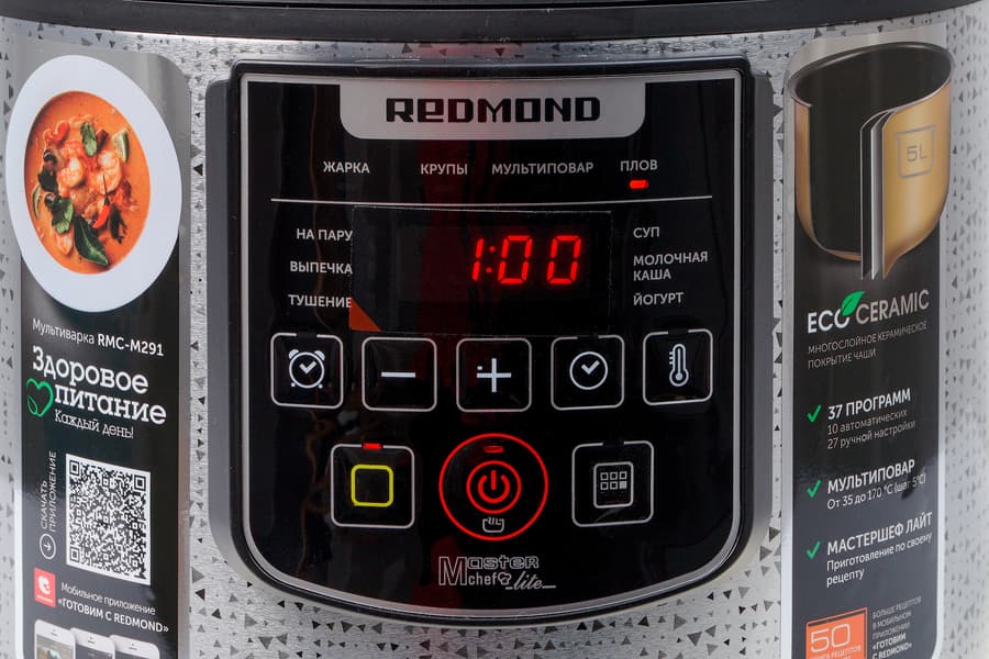 Мультиварка Redmond RMC-M291 — неплохой прибор с низким потреблением электричества. Мультиварка имеет 10 автоматических программ, наиболее востребованных в домашнем приготовлении пищи, не требующих никакого вмешательства в процессе. Но для удобства пользователя в любой программе возможно изменение настроек времени и температуры. В чаше с антипригарным покрытием объемом 5 л можно приготовить в среднем 4-5 полноценных порций.