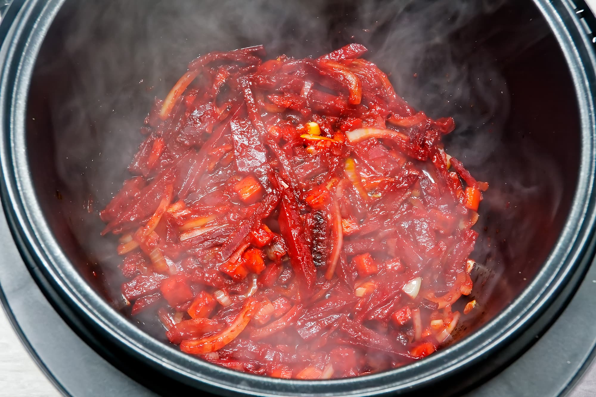 В чашу мультиварки наливаем растительное масло, выбираем программу «жарка» и в течение 15 минут обжариваем лук, морковь, свеклу и томатную пасту, периодически помешивая.