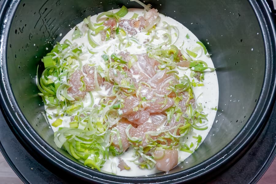Выкладываем все ингредиенты в чашу мультиварки, заливаем сливками и молоком, добавляем специи и соль, перемешиваем, готовим на программе «тушение» 30 минут.