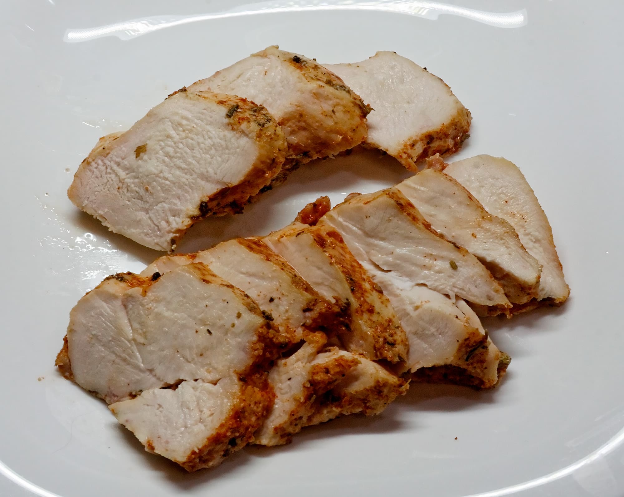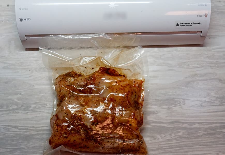 Для приготовления курицы мы взяли бескостное куриное филе, добавили соль, специи (прованские травы, черный перец, паприку), поместили курицу в пакет и готовили на программе «вакуум» в течение 3 часов (авторы рецепта сообщили нам, что 500 г курицы будут готовы через 2 часа, но поскольку вес наших куриных грудок составил около килограмма, мы решили увеличить время).
