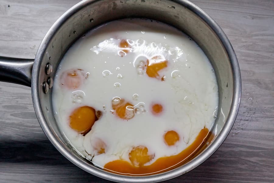 Яйца с молоком взбиваем венчиком до однородной массы, добавляем специи и соль, перемешиваем.