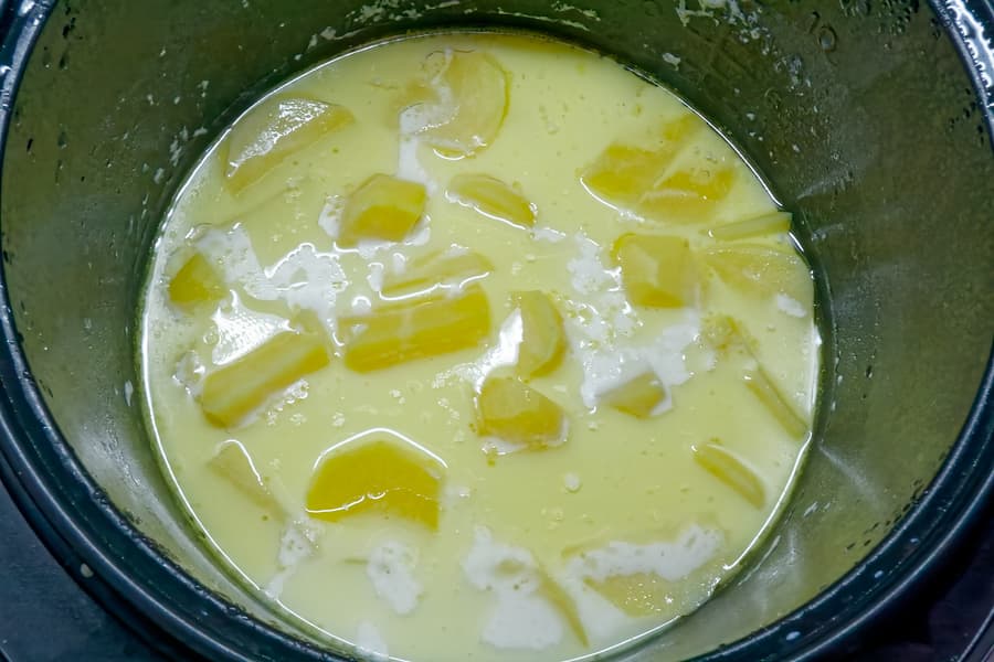 Очищенный картофель разрезаем на шесть частей, выкладываем в чашу мультиварки, заливаем молоком и водой, добавляем сливочное масло и соль.