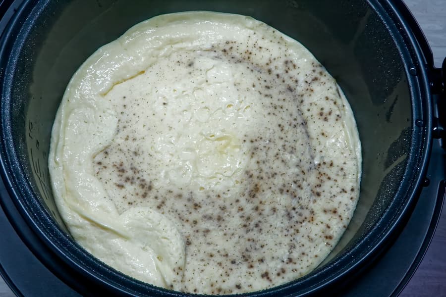 Чашу мультиварки смазываем сливочным маслом, выливаем яично-молочную смесь, закрываем крышку.