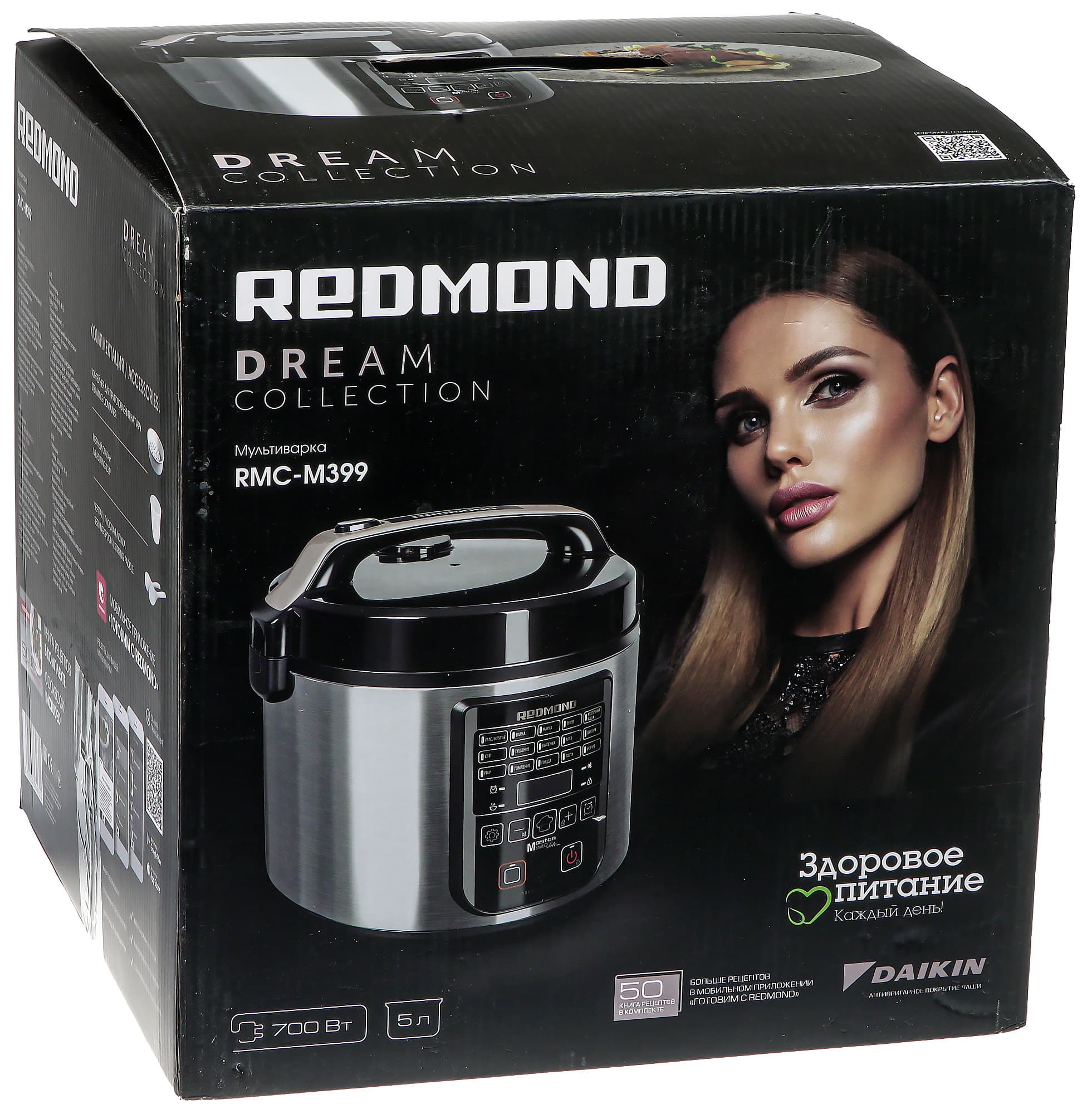 Мультиварка пришла на тестирование, упакованная в квадратную картонную коробку. На коробке, как обычно у Redmond, мы видим женский портрет, фотографии прибора и блюд, которые в нем можно приготовить и техническую информацию о модели. Для удобства переноски предусмотрена пластиковая ручка сверху. Мультиварка надежно защищена внутри упаковки пенопластовыми вставками.