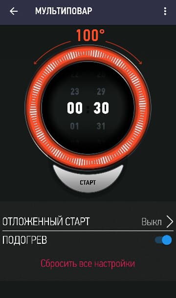 Наконец, рассмотрим последний пункт главного меню — автоматические программы. При нажатии на соответствующую кнопку пользователь видит на экране телефона список программ. Кликнув на программу, переходим к установке продолжительности процесса приготовления и дополнительных функций — отложенному старту и подогреву.