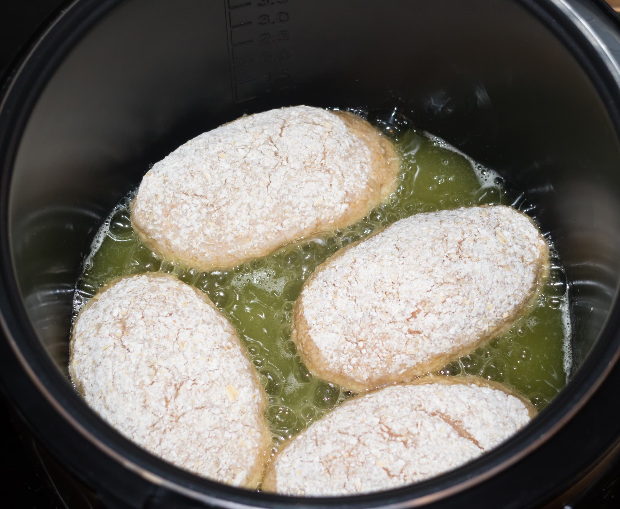 Котлеты отлично, несмотря на закрытую крышку, поджарились. Корочка получилась хрустящая, плотная. Внутри мягкие, сочные, с вытекающей сырной начинкой.