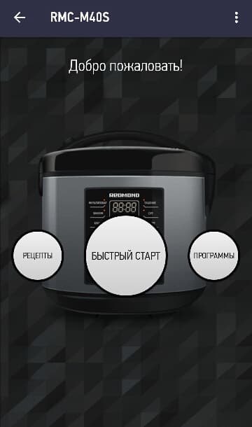 После запуска приложения необходимо создать аккаунт или войти в существующий. Затем нужно подключить мультиварку к электричеству, нажать и удерживать в течение 5 секунд кнопку «+». Во время соединения на дисплее будут отображаться движущиеся квадратики. После установки соединения прибор подаст звуковой сигнал и перейдет в режим ожидания. В приложении в списке подключенных устройств появится мультиварка RMC-M40S, при нажатии на устройство на экран телефона выводится следующее меню: