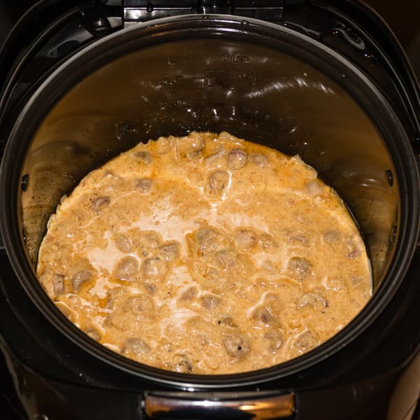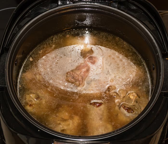 Установили программу «Томление», увеличив продолжительность цикла до 8 часов и не отключив функцию подогрева — пусть готовый насыщенный бульон сохраняется теплым до тех самых пор, когда появится время для окончательного этапа приготовления холодца — разбора мяса и заливки в форму. Температура бульона в ходе непосредственно томления колебалась между 88 и 95 °C. Жидкость слегка побулькивала, почти кипя, но не переходя в стадию активного кипения.