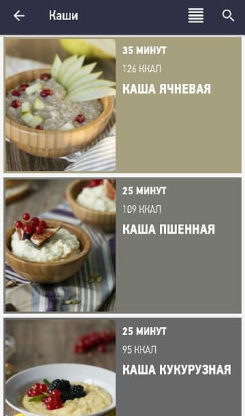 При переходе в пункт меню «Рецепты» пользователь видит список рецептов, сгруппированный по категориям блюд. При переходе в категорию можно просмотреть все имеющиеся в базе рецепты. В каждом рецепте есть три вкладки: процесс, ингредиенты, заметки. Запустить процесс приготовления можно прямо из рецепта, без установки программы, времени и температуры.