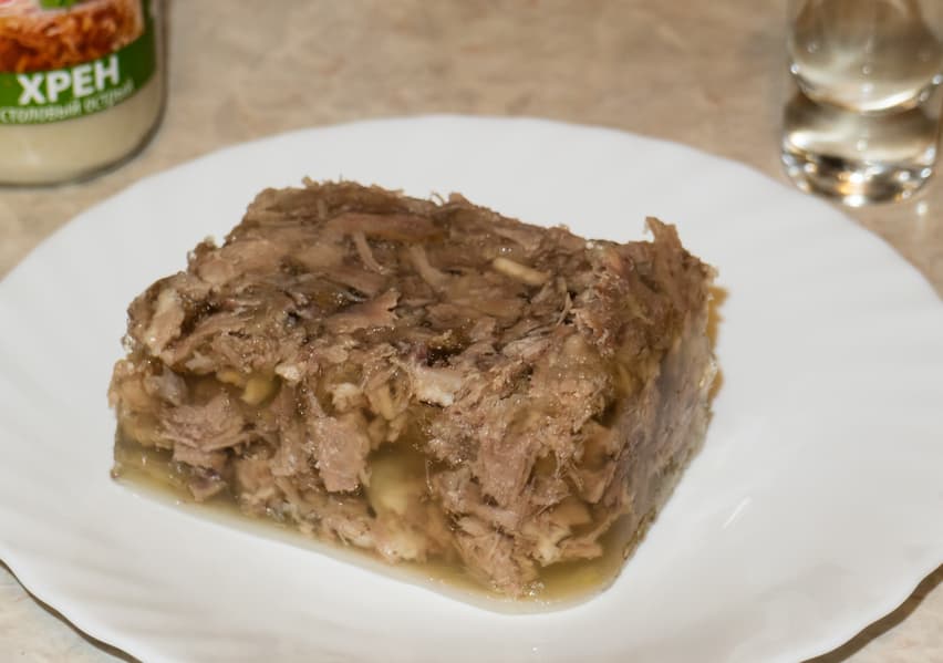 К вечеру получили хорошо застывшее и плотное желе с большим количеством мягкого, отлично проваренного мяса. Желатин дополнительно не добавляли. За 8 часов томления из костей и свиной ножки выварились все необходимые вещества, позволившие приготовить холодец высокого качества.