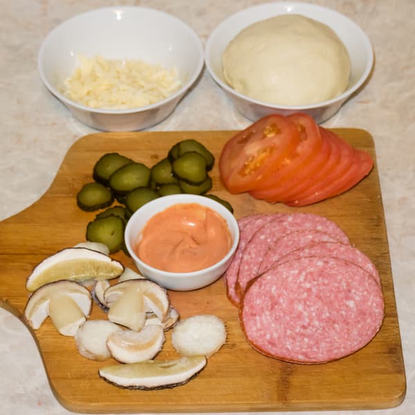 Взяли, как рекомендует рецепт из комплектной книги, 160 г теста. Сформовали лепешку, уложили ее в чашу и расправили по дну, сделав небольшие бортики. Смазали тесто смесью майонеза и томатной пасты, посыпали сухим базиликом. Уложили ломтики полукопченой колбасы, грибов, помидоров, сверху посыпали натертым сыром.