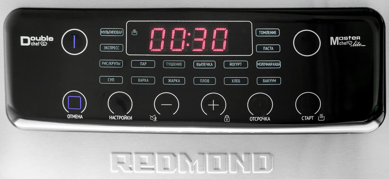 При одновременной готовке в двух чашах на дисплее отображается программа той чаши, кнопка которой горит постоянно, не мигает. Для отображения текущей программы чаши с мигающей кнопкой надо просто нажать на мигающую кнопку. Вокруг дисплея расположены индикаторы 16 автоматических программ, для выбора нужной индикаторы переключаются кнопками «+» и «−». Запуск программы происходит кнопкой «старт», отмена — кнопкой «отмена». Кнопка «настройки» отвечает за изменение времени и/или температуры в любой автоматической программе, кроме программы «экспресс». Управление простое и интуитивно понятное. Дисплей достаточно яркий. Кнопки нажимаются легко, сенсоры чувствительные, влажность рук на распознавание не влияет.