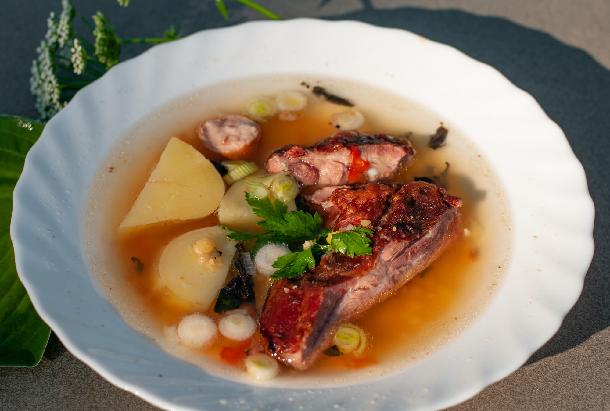 В одну емкость поставили вариться бульон из мяса на кости, в другую — свеклу без ботвы. Как только свекла сварилась до полуготовности, вытащили ее, остудили, очистили. В бульон добавили картошку и морковь, нарезанную большими кусками.