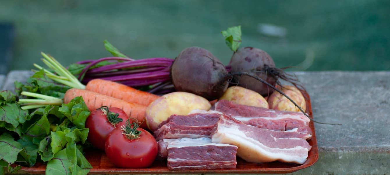 Для борща мы взяли молодую свеклу, говяжьи и свиные ребра, картофель, морковь, помидоры, немного растительного масла и соль.