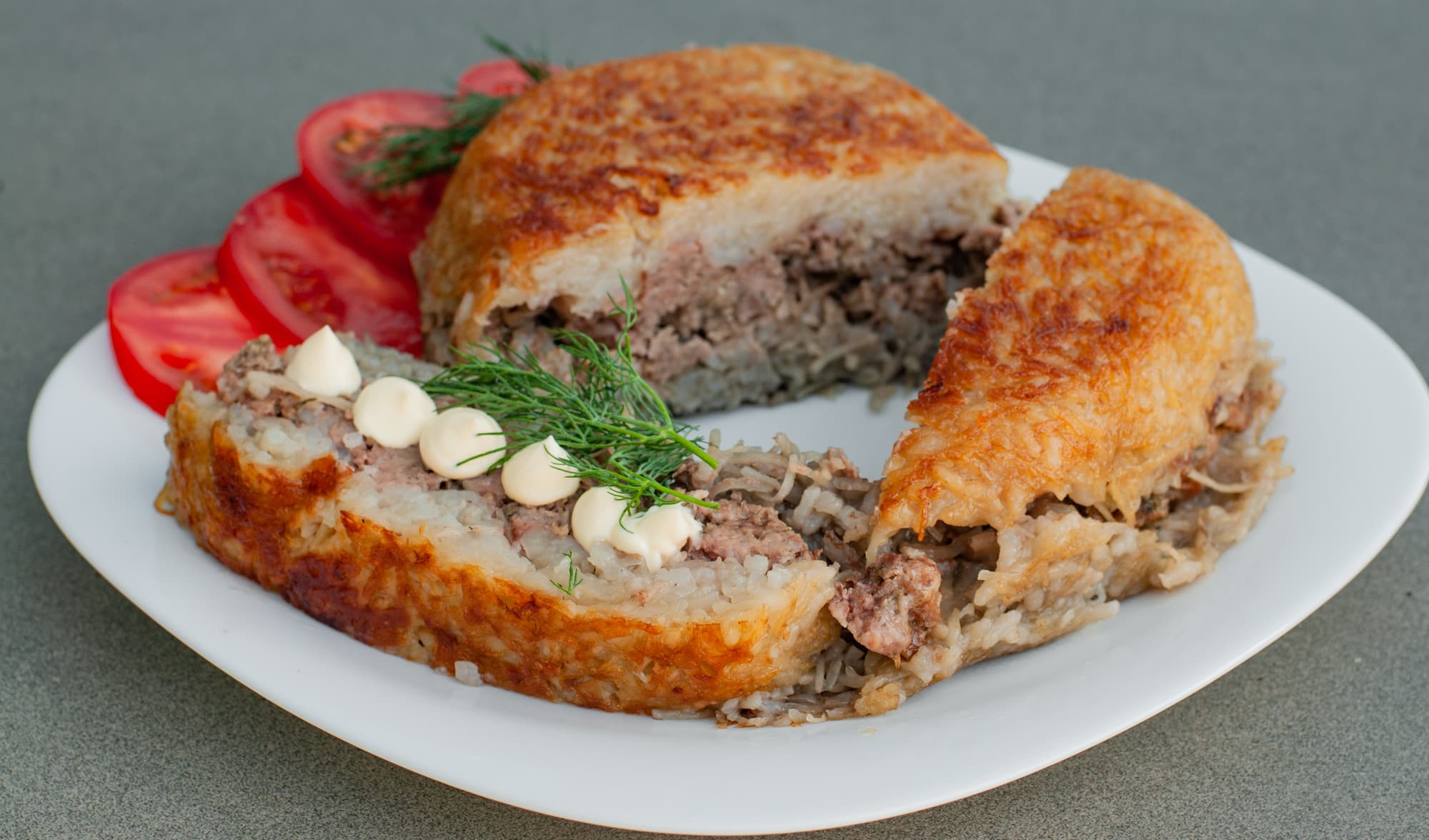 Мы взяли фарш, тертый картофель, немного вареного риса, соль, специи.