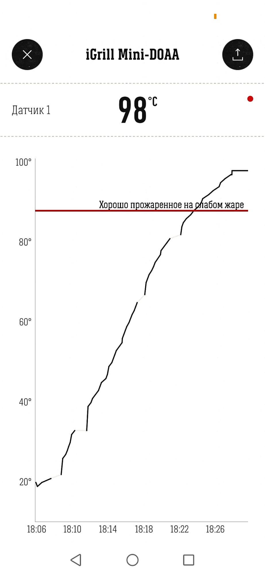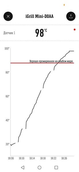 По данным датчика температуры Weber iGrill, 1 литр воды на программе «экспресс» нагрелся с 20 °C до 98 °C за 20 минут.