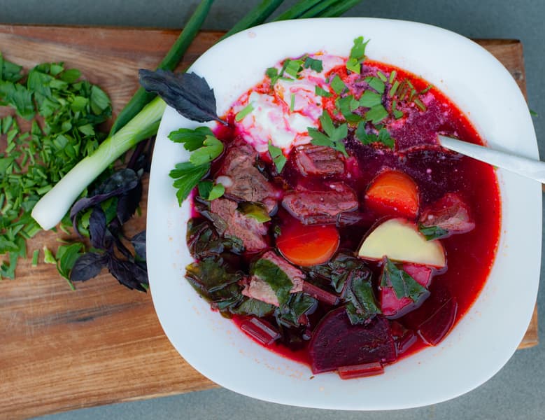 Теперь для идеального по цвету и вкусу борща осталось только налить бульон с мясом и овощами в тарелку, добавить туда тушеную свеклу, подать со сметаной и зеленью.