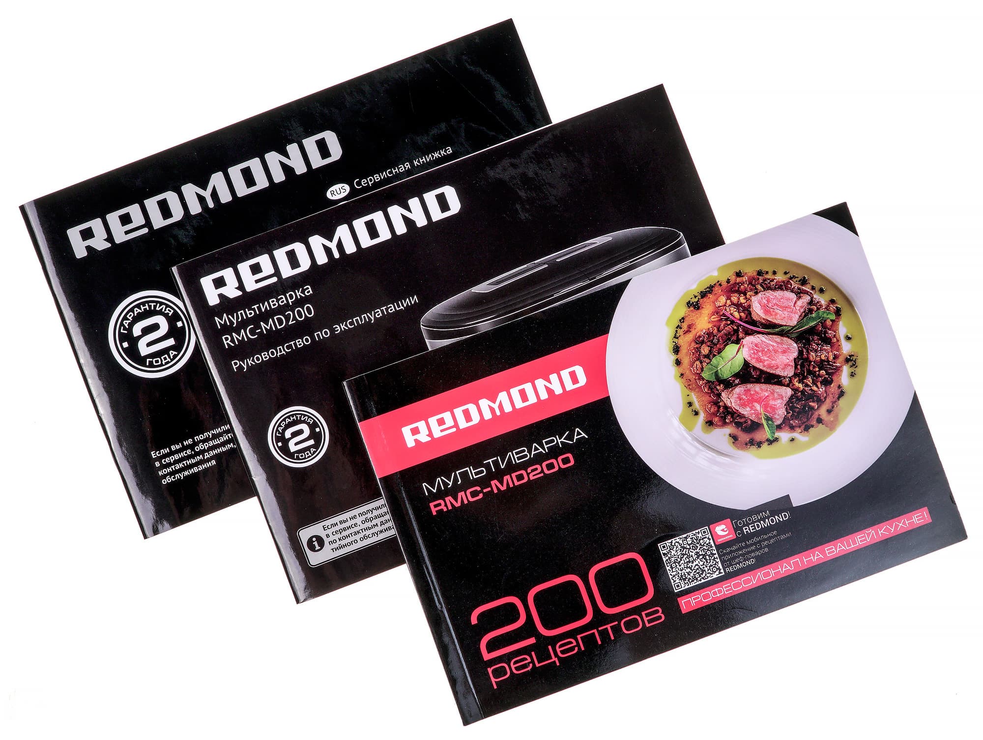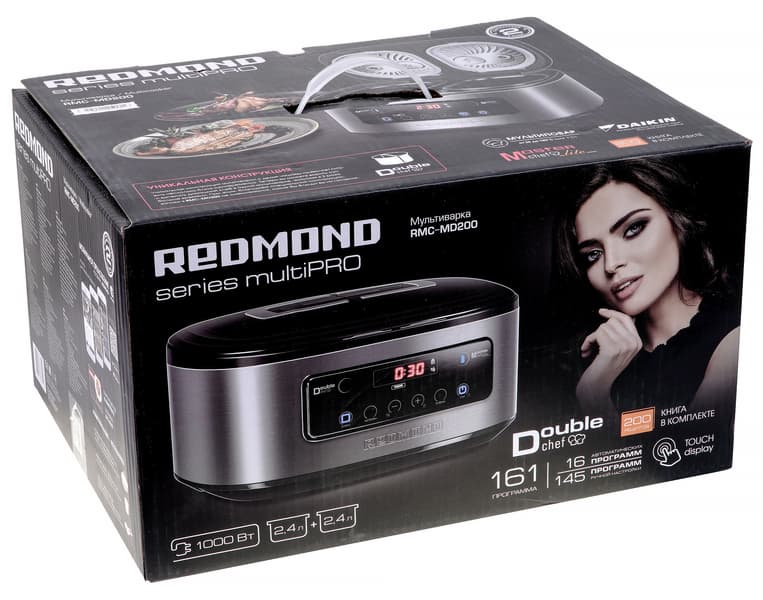 Мультиварка прибыла на тесты в красивой плотной картонной коробке стандартного дизайна Redmond. На черном фоне фотография устройства, лицо задумчивой брюнетки и основные характеристики модели. Вместе с этим на коробке мы видим рекламу мобильного приложения «готовим с Redmond», комплектацию и красочные фотографии блюд, приготовленных в RMC-MD200.