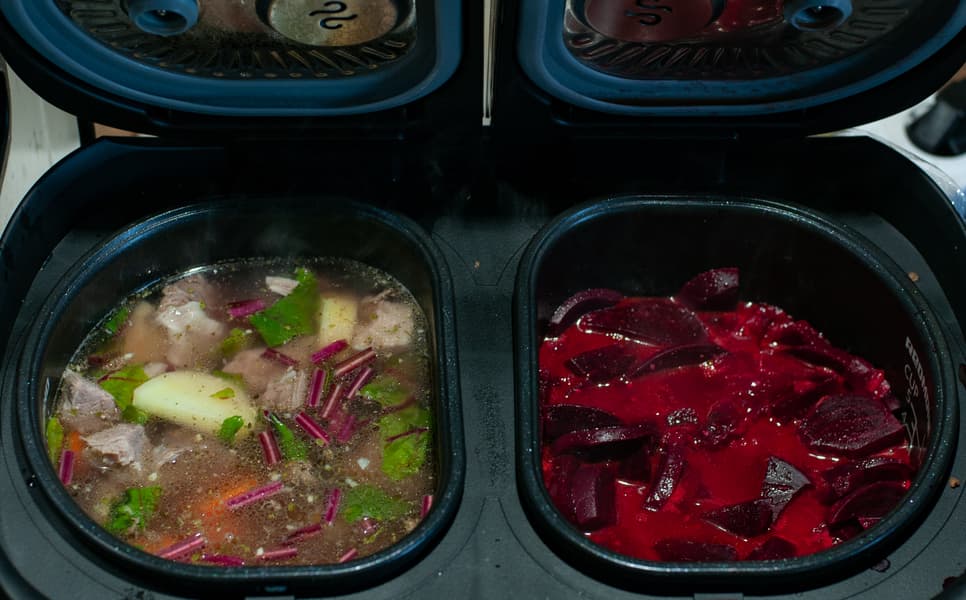 Данный рецепт позволяет не только добиться идеального насыщенного цвета и вкуса, но и оставляет выбор между борщом и просто наваристым мясным супом. По такой методике мы и раньше варили борщ, но зажарку из свеклы делали на сковороде. Мультиварка RMC-MD200 дает возможность не использовать другую посуду и другие устройства.