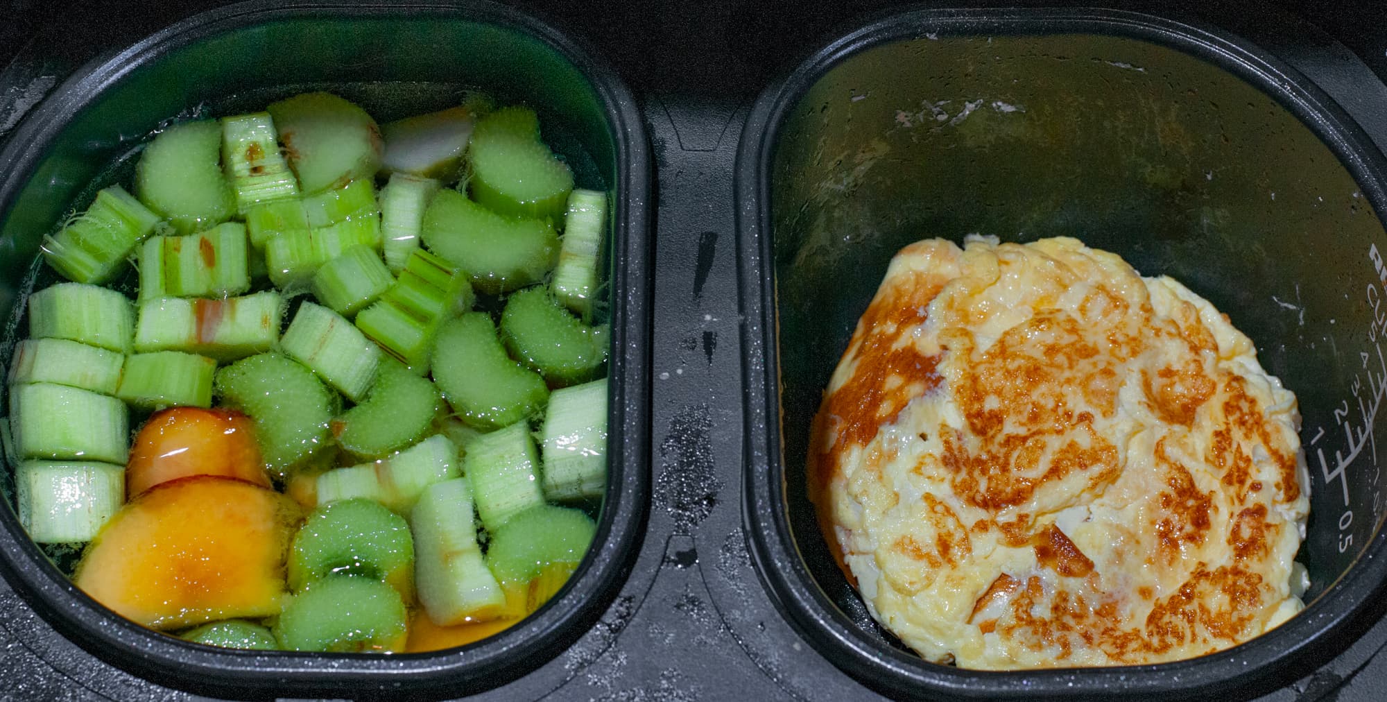 Вдохновившись результатами предыдущего теста, мы решили одновременно сварить деликатный компот из ревеня и поджарить омлет с чесноком.