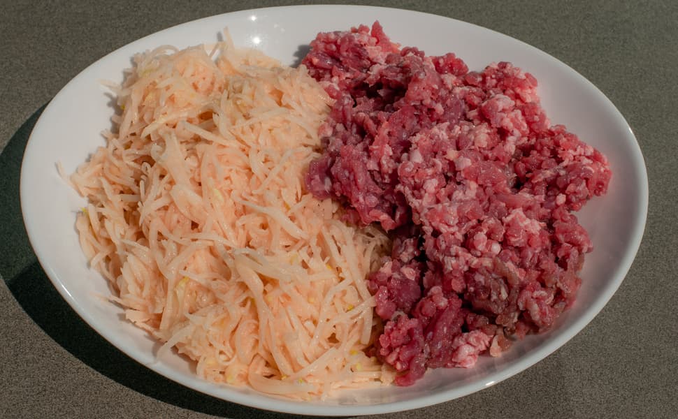 Для рагу мы смешали тертые кабачки, картофель, говяжий фарш и специи. Выложили смесь в чашу мультиварки. Сверху установили контейнер для приготовления на пару́ с небольшими котлетками из говяжьего фарша с чесноком и специями.