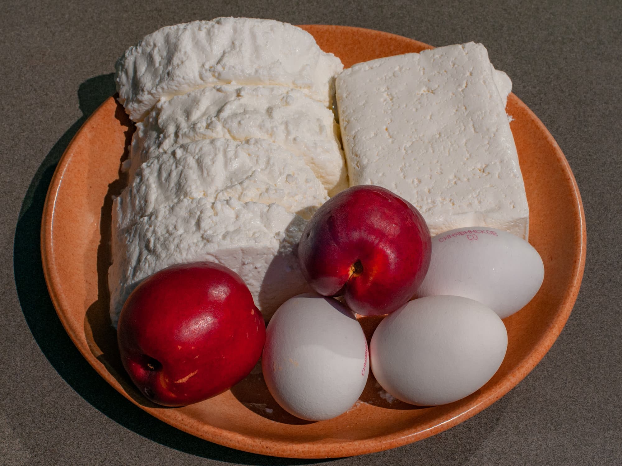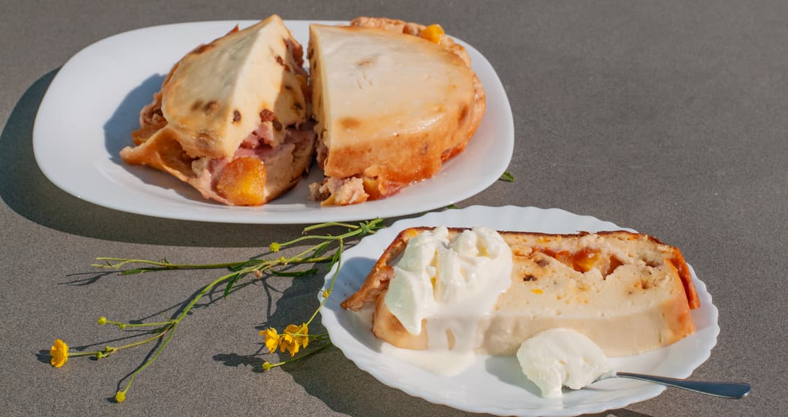 Для творожного десерта нам понадобился творог, яйца, масло, персики, изюм, сахар и немного муки. Персики (нектарины) порезали крупными кусками, остальное тщательно взбили в блендере. Массу вылили в чашу мультиварки, положили в нее кусочки персиков и изюм. Поставили на режим «выпечка» на 1,5 часа.
