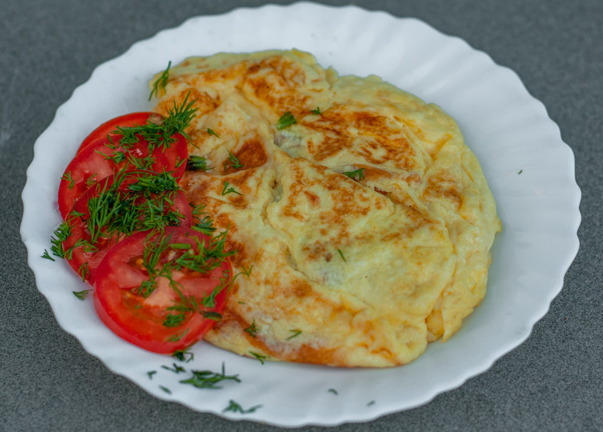 Соседнюю емкость поставили на режим «жарка». Как только емкость нагрелась, сбрызнули ее маслом и вылили в нее взбитые яйца (2 шт.) со сметаной и чесноком. Жарили пару минут с закрытой крышкой, затем открыли, перевернули омлет и дожаривали с открытой. Повторили для еще 4 яиц. Все это время в другой емкости варился компот.