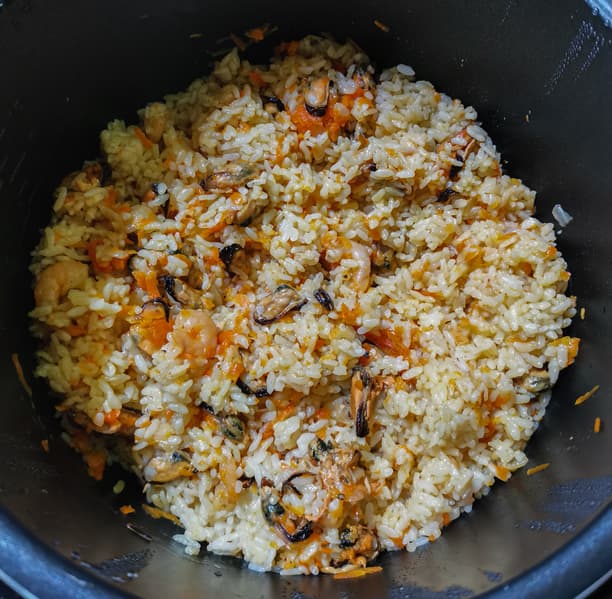 Разложили овощи с морепродуктами снизу, рис разровняли сверху и долили воды. Нам показалось, что воды совсем мало, но мы решили точно следовать рецепту и не прогадали. Выставили программу «плов» на 15 минут. После окончания программы подождали 10 минут, сбросили давление.