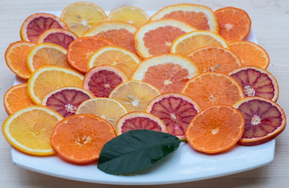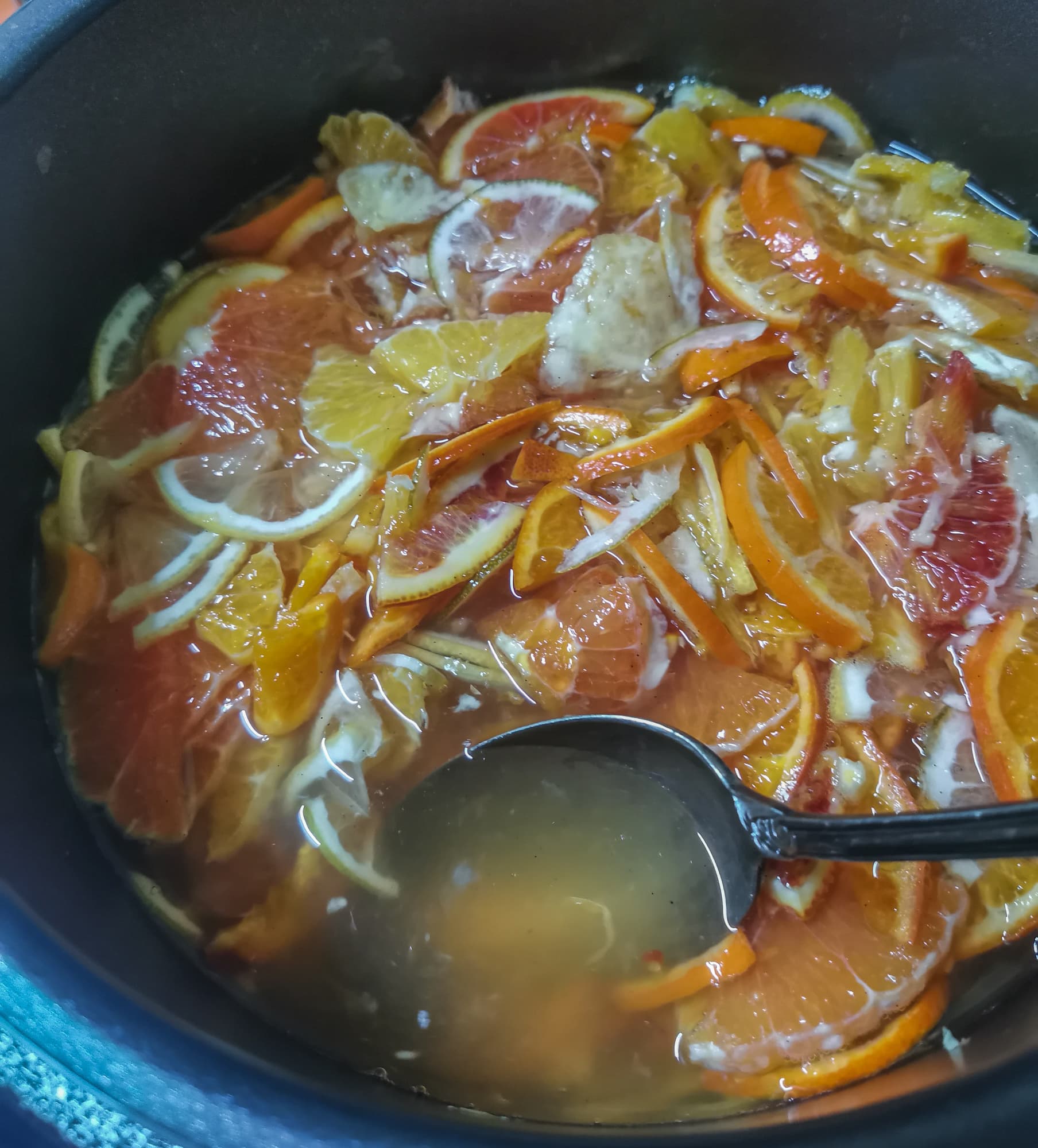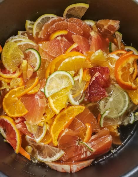 Для такого экзотического варенья мы нарезали тонкими кусочками прямо с кожурой лайм, лимон Лисбон, лимон Мейера, апельсины оранжевый, красный сицилийский и розовый Кара-Кара, мандарины танжерин и минеолу.