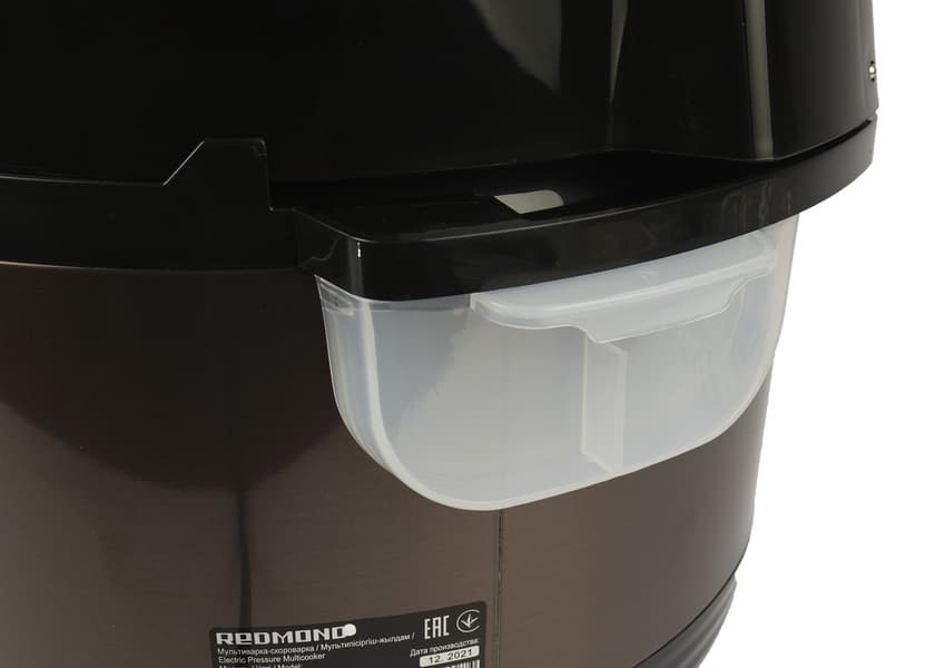 Сверху съемной крышки расположен паровой клапан, механический индикатор давления красного цвета и выступающая сверху ручка с кнопкой открытия парового клапана. Рядом с индикатором давления и около ручки наклейки с предупредительной надписью.
