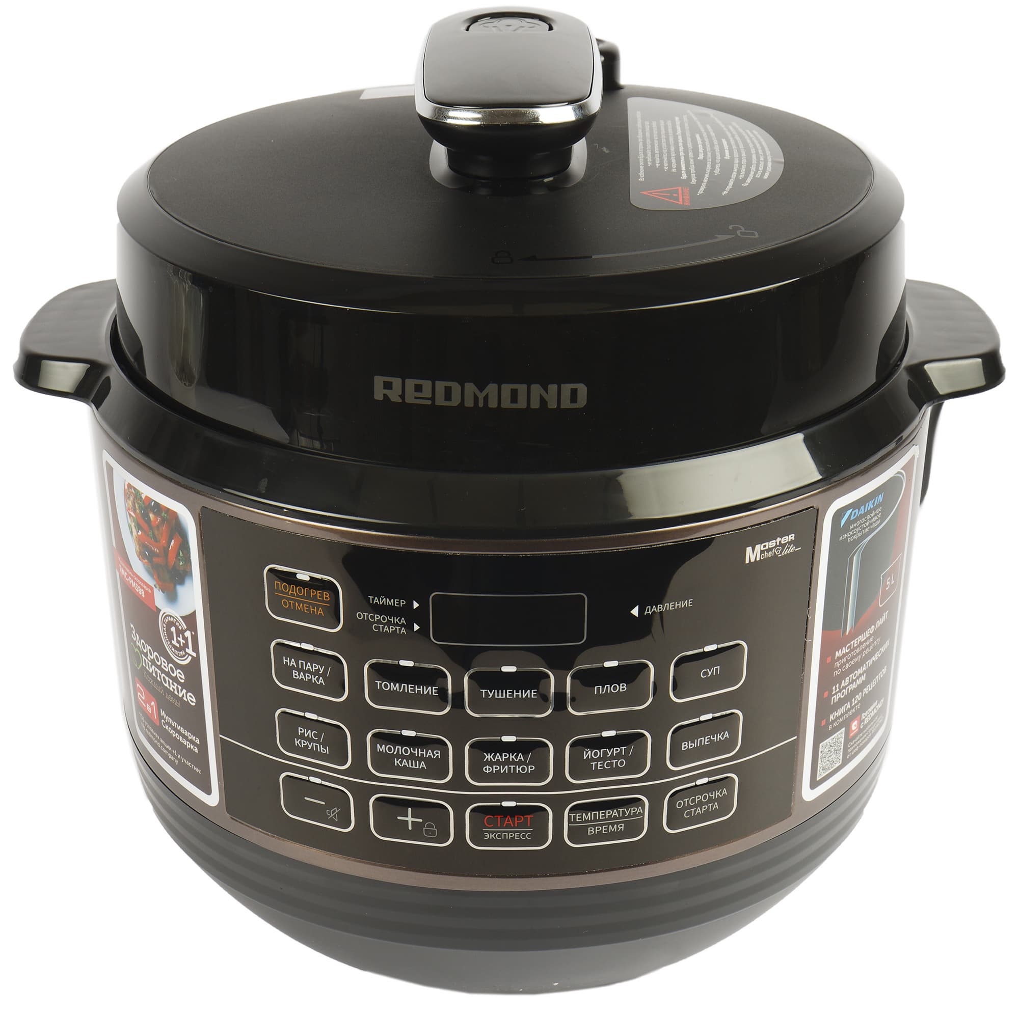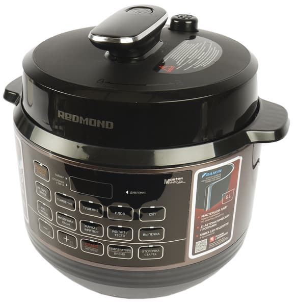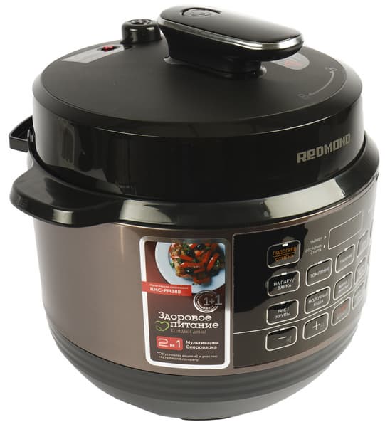 А мультиварка-скороварка Redmond RMC-PM388 совмещает возможности сразу двух современных приборов — классической мультиварки и мощной скороварки, и готовит пищу не только в обычном режиме, но и в ускоренном, под высоким давлением. Redmond RMC-PM388 оснащена системой защиты: датчики давления и температуры контролируют показатели в камере, и если параметры станут значительно выше нормы, система защиты автоматически снизит их, не останавливая процесс приготовления, или отключит прибор.