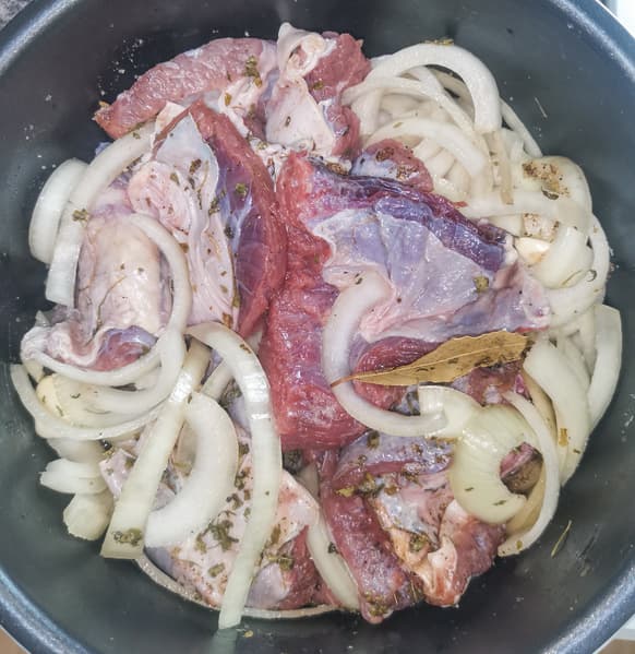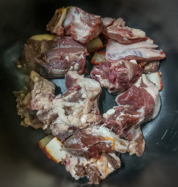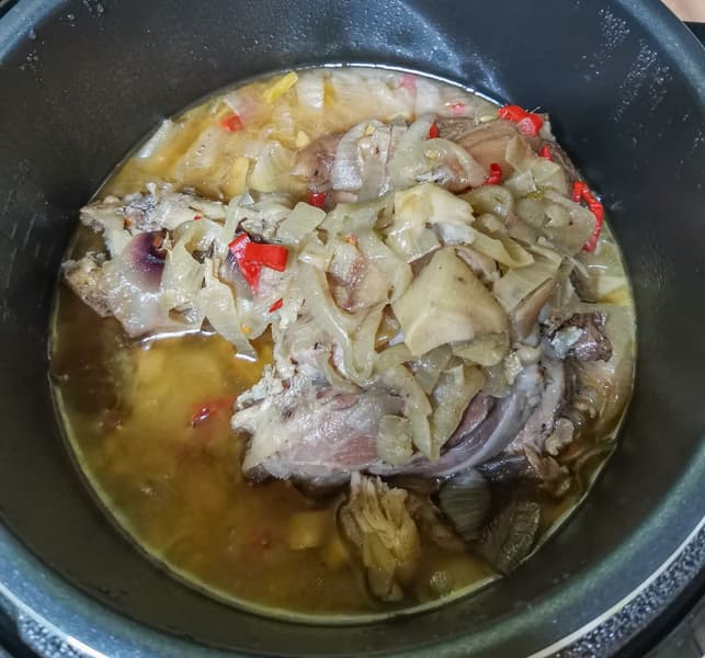 Сложили подготовленные продукты в чашу, выставили программу томления на 2 часа. После окончания проверили готовность. Овощи, конечно, приготовились, но мясо было совершенно жестким сверху, чуть лучше снизу, где находилось в соку. Но все равно рулька была еще совершенно не готова.