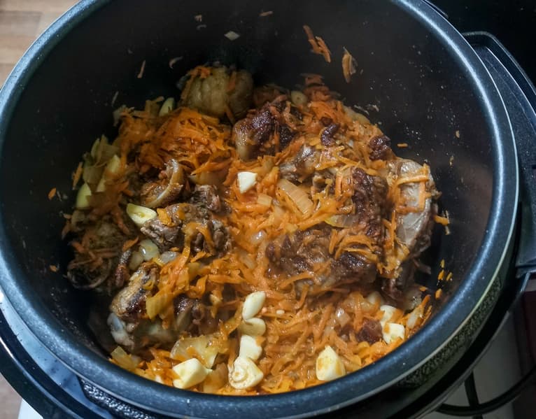 Для плова мы взяли баранину с костями, разделали на некрупные куски и обжарили на копченом курдючном сале в режиме жарки.