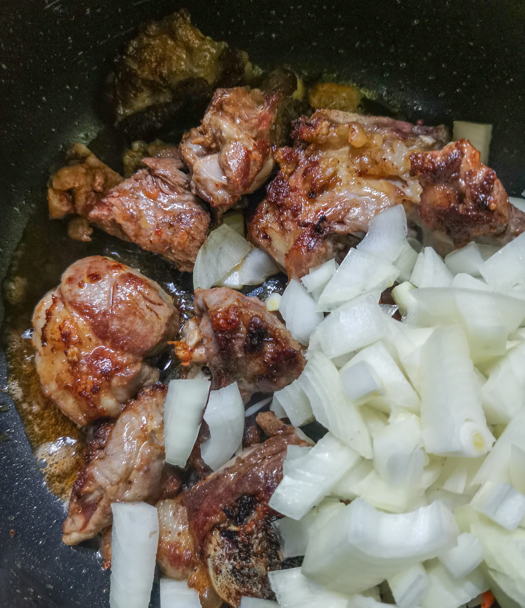 К получившемуся обжаренному до корочки мясу добавили лук, специи и морковь. Немного подержали смесь в режиме жарки.
