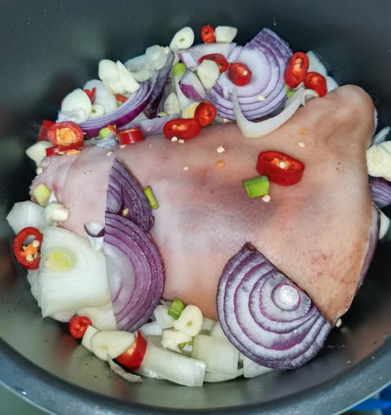 Вдохновившись пловом, мы решили приготовить рульку по рецепту книги из комплекта. Для этого взяли рульку, лук, острый перец, воду, специи, масло, соль.
