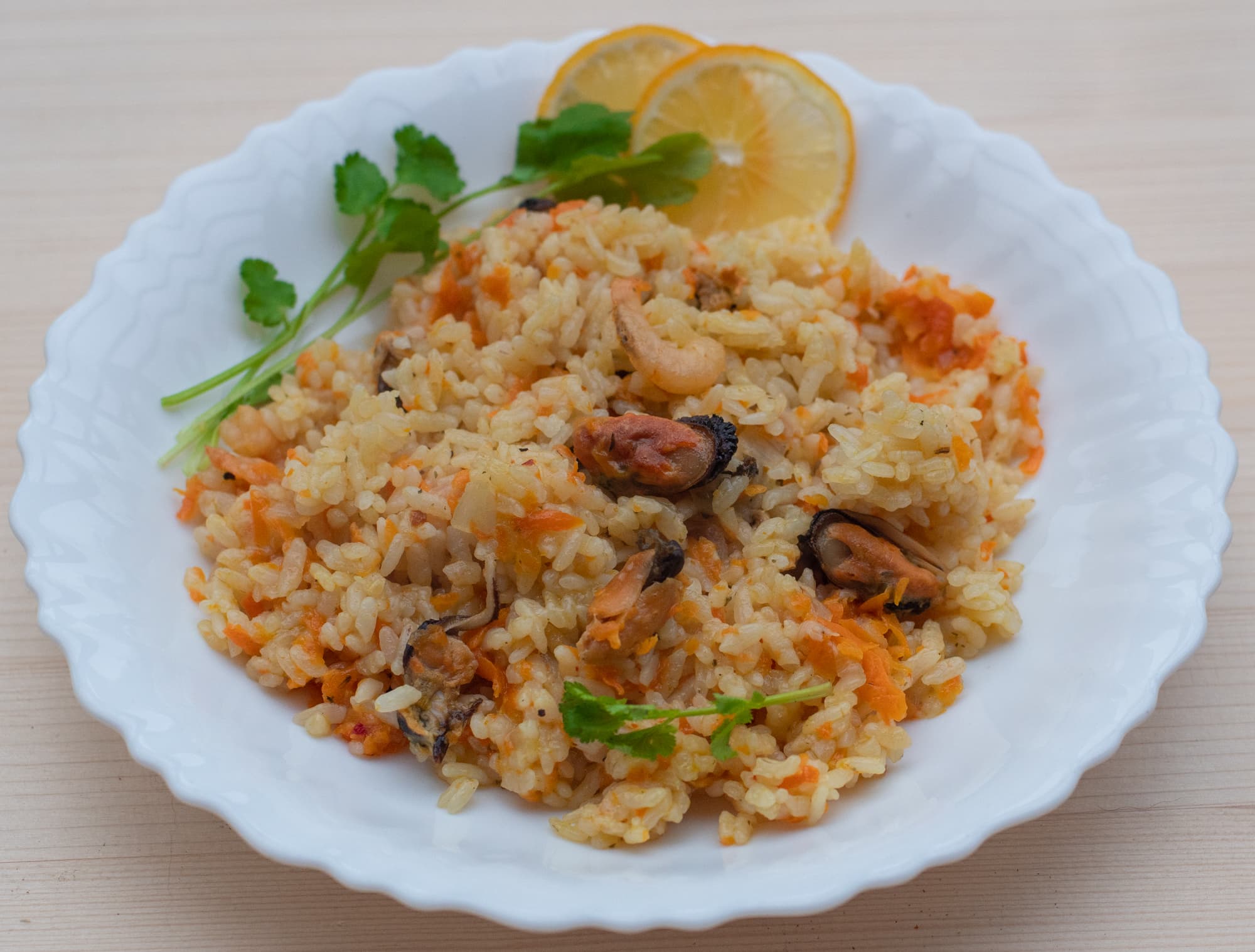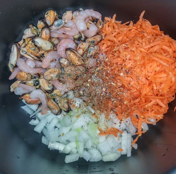 Строго следуя пропорциям, данным в книге рецептов, мы взяли мидии и креветки, морковь, лук, рис, специи и воду.