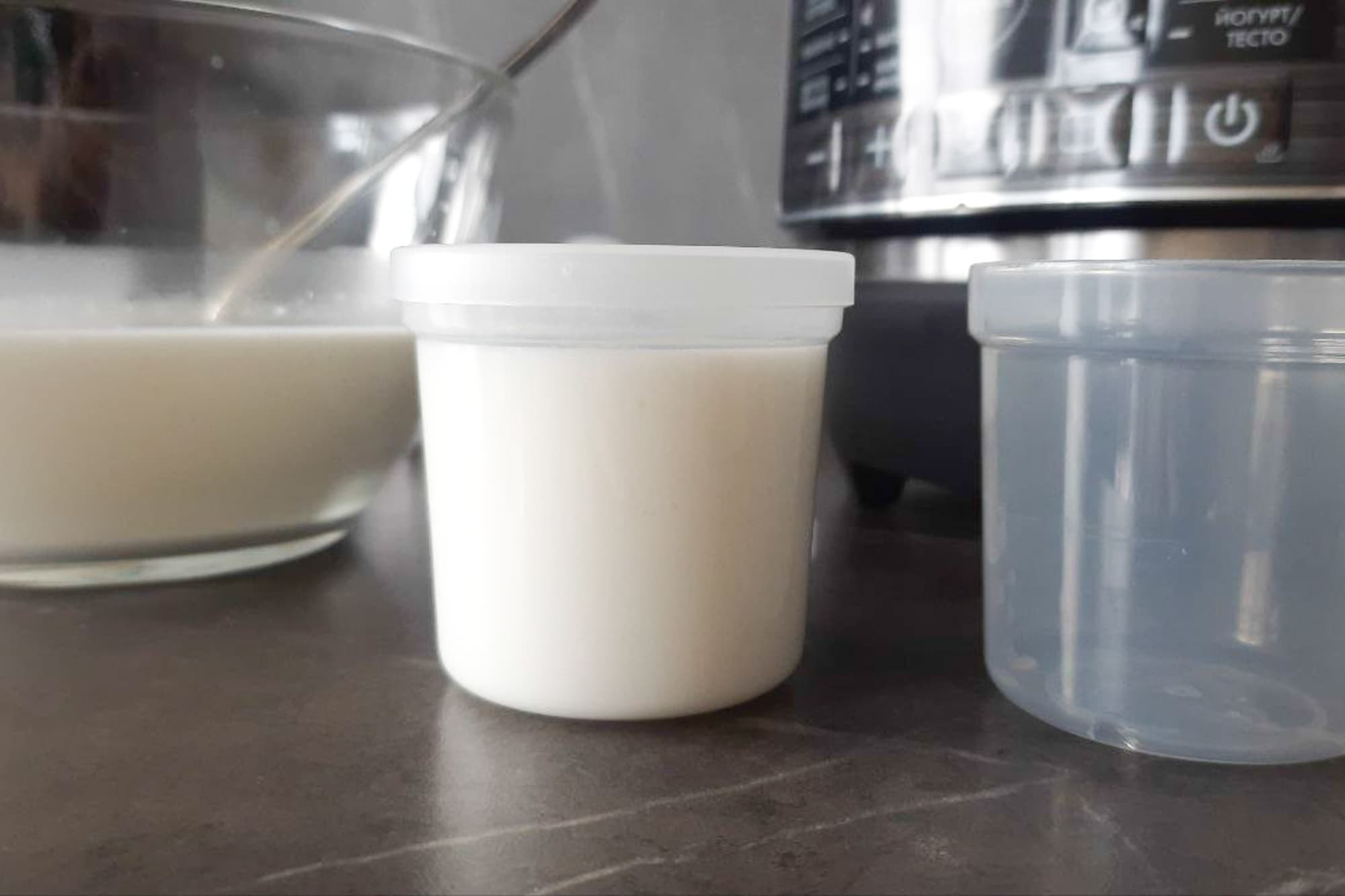 Redmond RMC-PM504, как мы помним, комплектуется симпатичными баночками для йогурта и имеет специальный режим для его приготовления, и мы решили не игнорировать этот факт. Взяли 550 мл молока жирностью 3,2% и 120 г густого йогурта без добавок жирностью 2%.