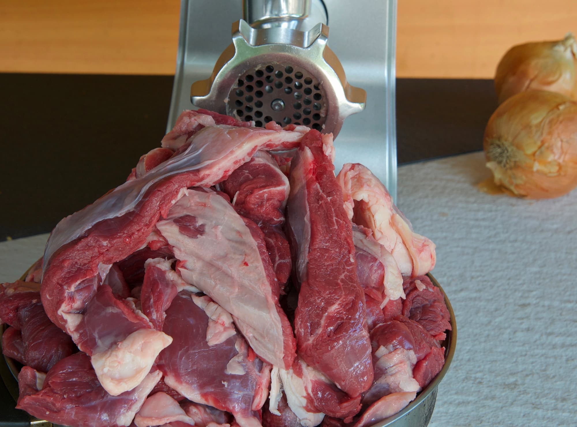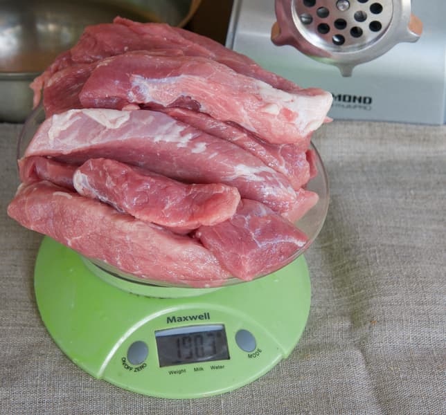 Используя самую большую решетку, мы прокрутили свинину в фарш на максимальной скорости.