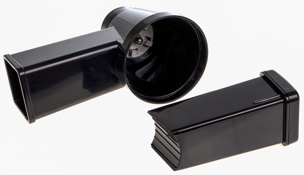 Съемный блок овощерезки пластиковый, с прямоугольной загрузочной горловиной. Лоток к нему уже не подходит.