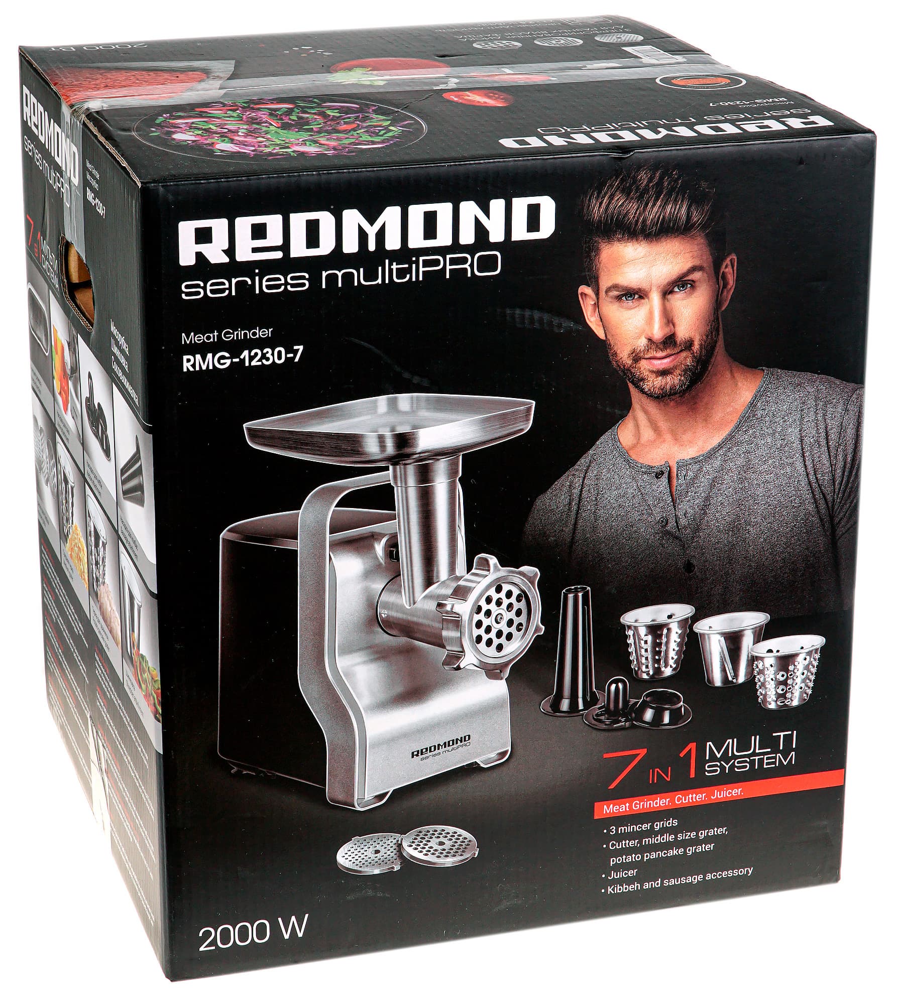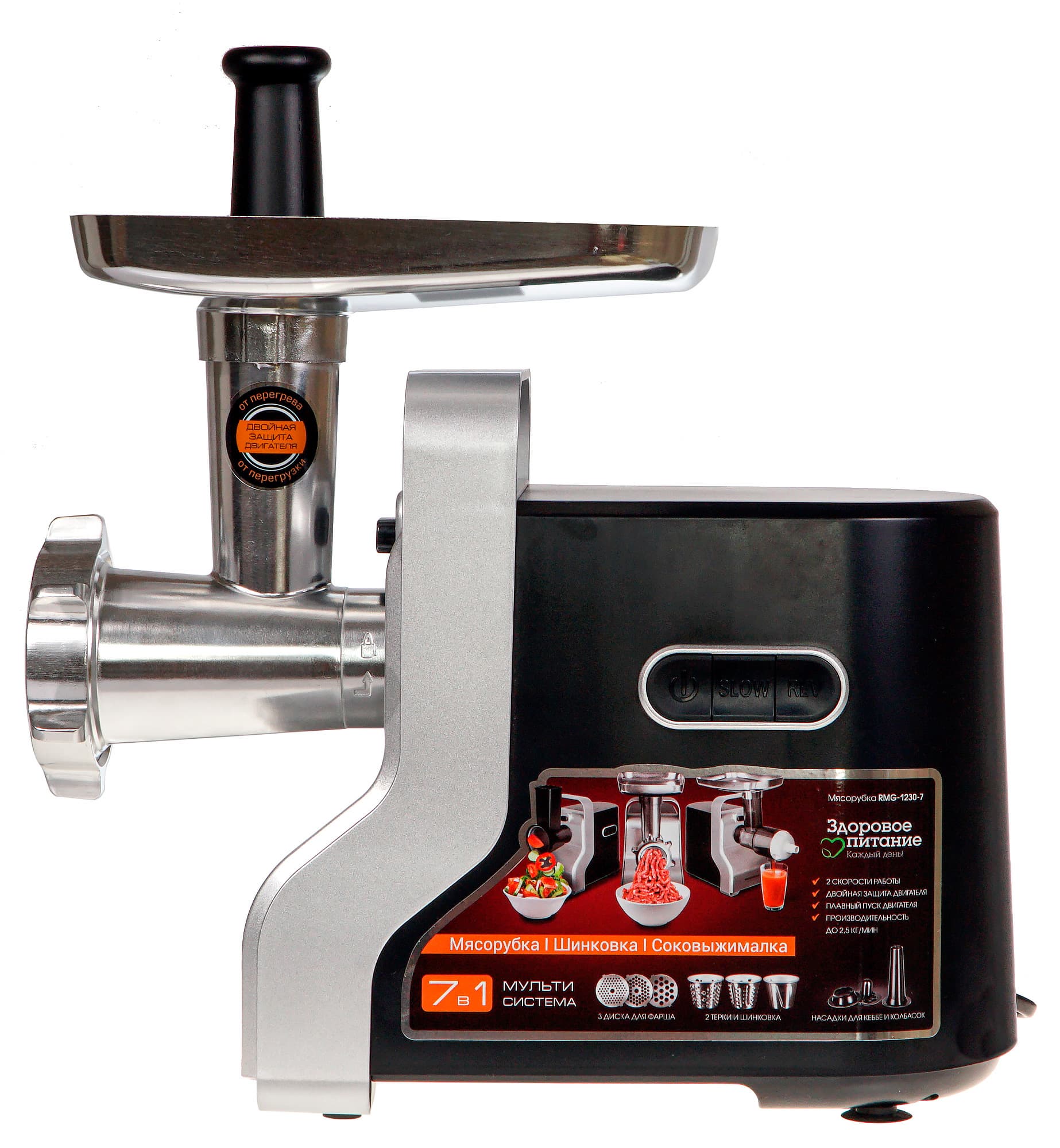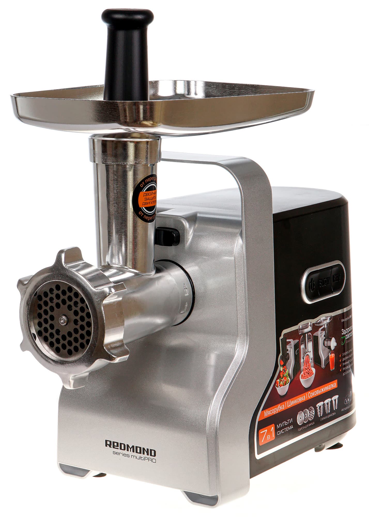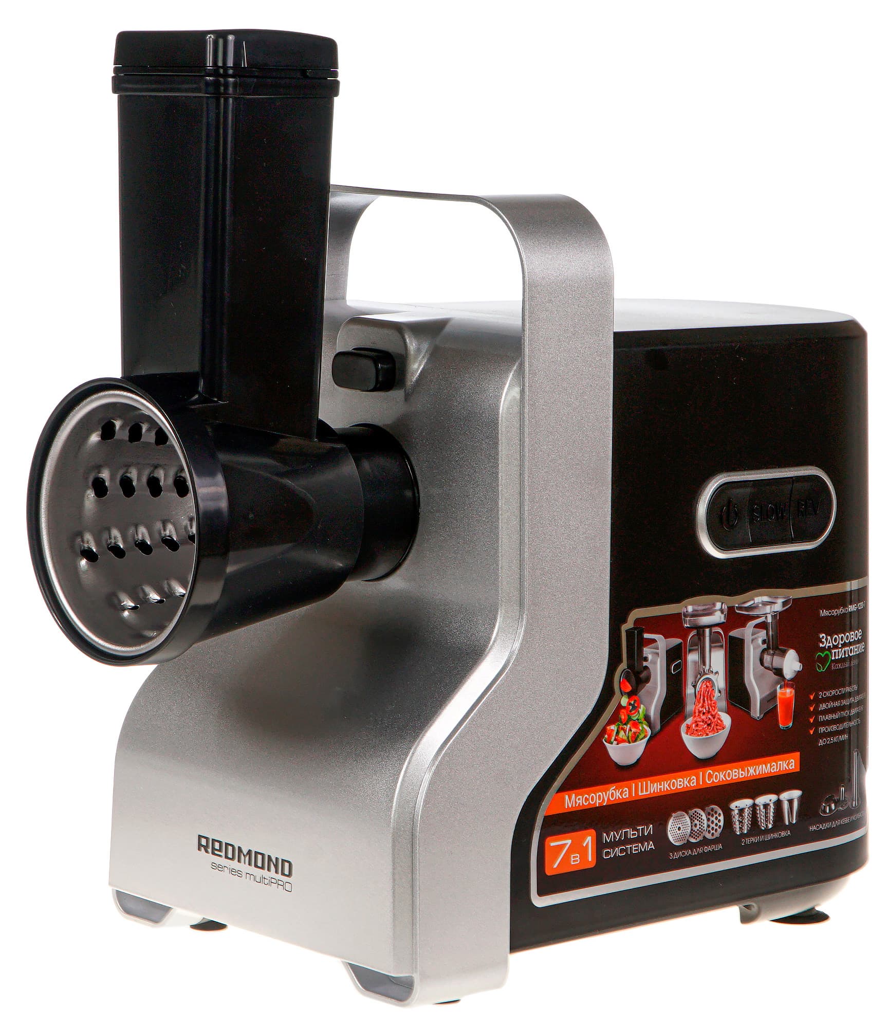 Компания Redmond выпустила на рынок модель RMG-1230-7, позиционируя ее как многофункциональное устройство 7 в 1, совмещающее в себе мясорубку, соковыжималку и овощерезку. При этом прибор снабжен функцией плавного пуска, двойной защитой (от перегрева и от перегрузки) и солидным набором аксессуаров.