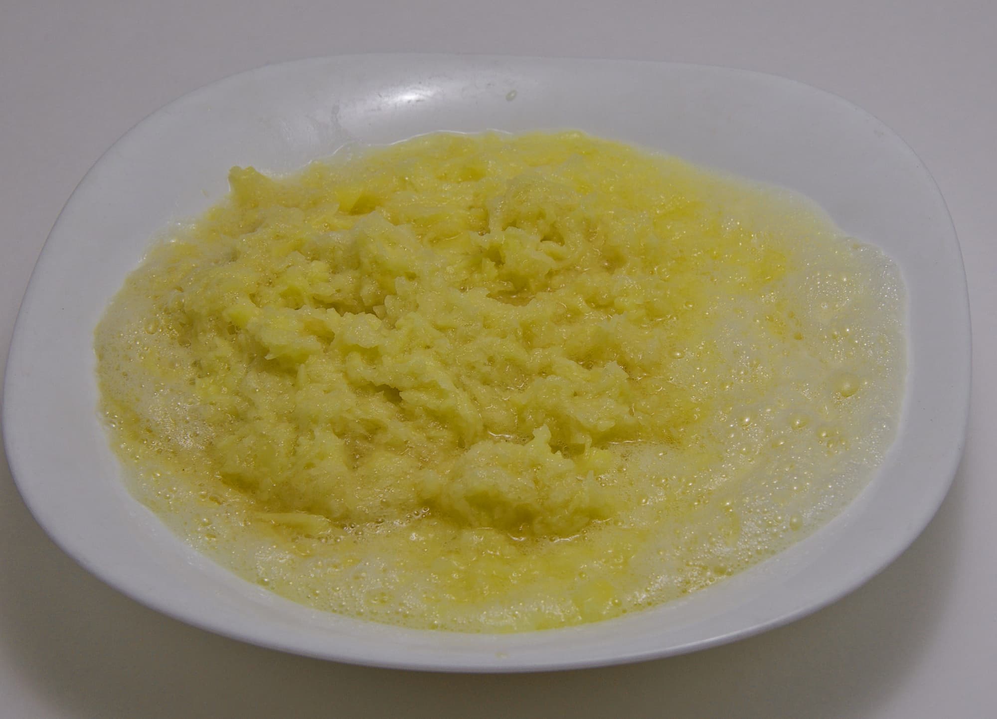 Мы посолили получившуюся массу, слили лишнюю жидкость и ложкой выложили ее на сковороду, промазанную маслом. Подравняли края и обжарили драники с двух сторон. Если бы не сложности с измельчением картошки, мы были бы вполне довольны результатом.