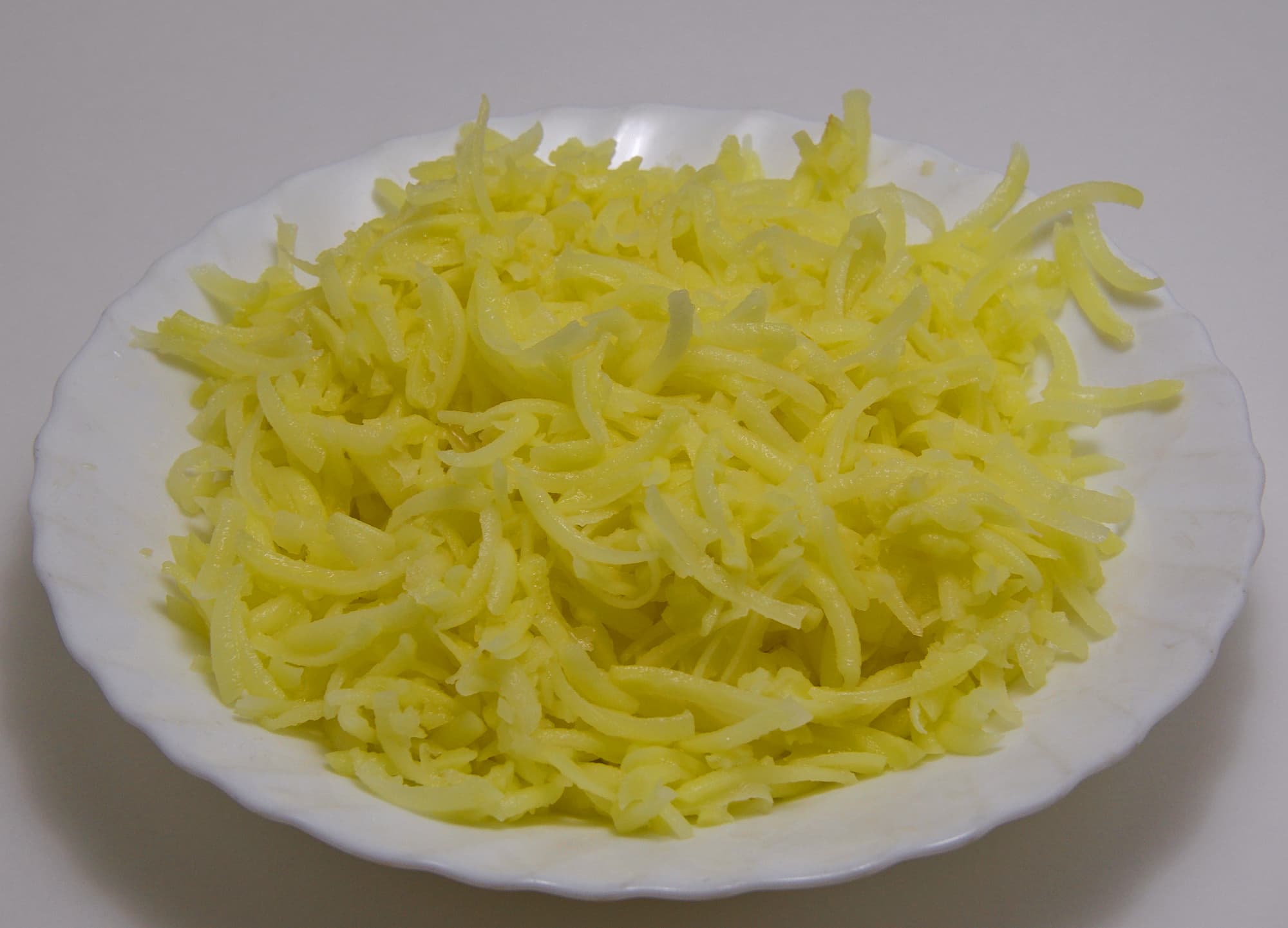 Такую стружку получается оформить в растрепанный драник, он не разваливается на сковороде даже без добавления муки и яйца.