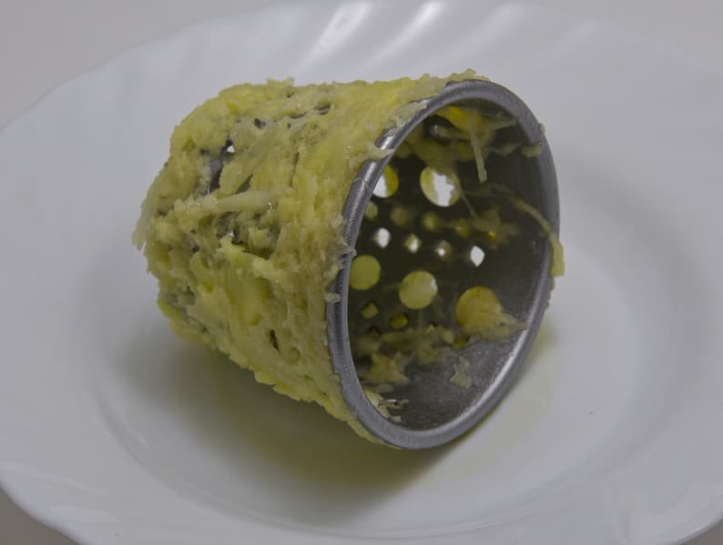 Хуже всего показала себя терка для драников. Для того чтобы протереть полтора килограмма картошки, нам пришлось приложить очень много усилий. Опытным путем было установлено, что резать картошку надо длинными ломтями, тогда она меньше забивает терку. Но все равно нужно очень сильно нажимать на толкатель, чтобы добиться хоть какого-то результата. Очистка терки не помогала, после каждых двух-трех картошин терка выглядела вот так: