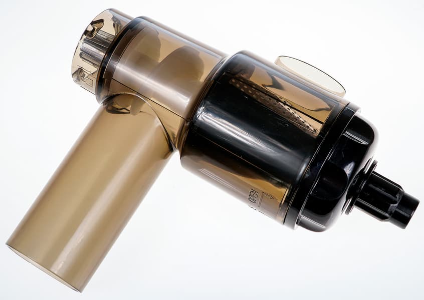 Съемный блок соковыжималки тоже пластиковый, со вставленным внутрь металлическим фильтром.