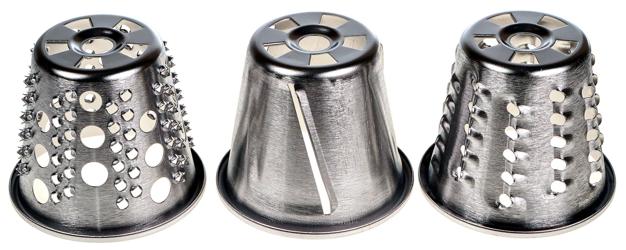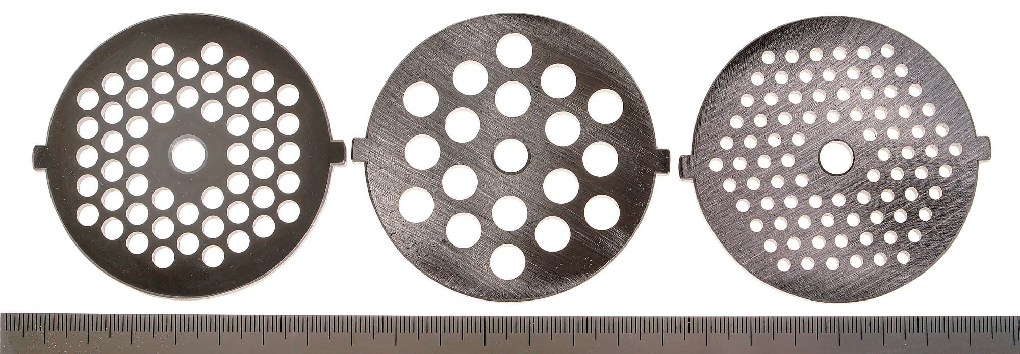 Решетки имеют три разных диаметра отверстий — 3, 5 и 8 мм — и предназначены для приготовления фарша — крупно нарубленного, стандартного и мелкоизмельченного. В общем, такой набор решеток достаточен для решения всех стандартных задач.