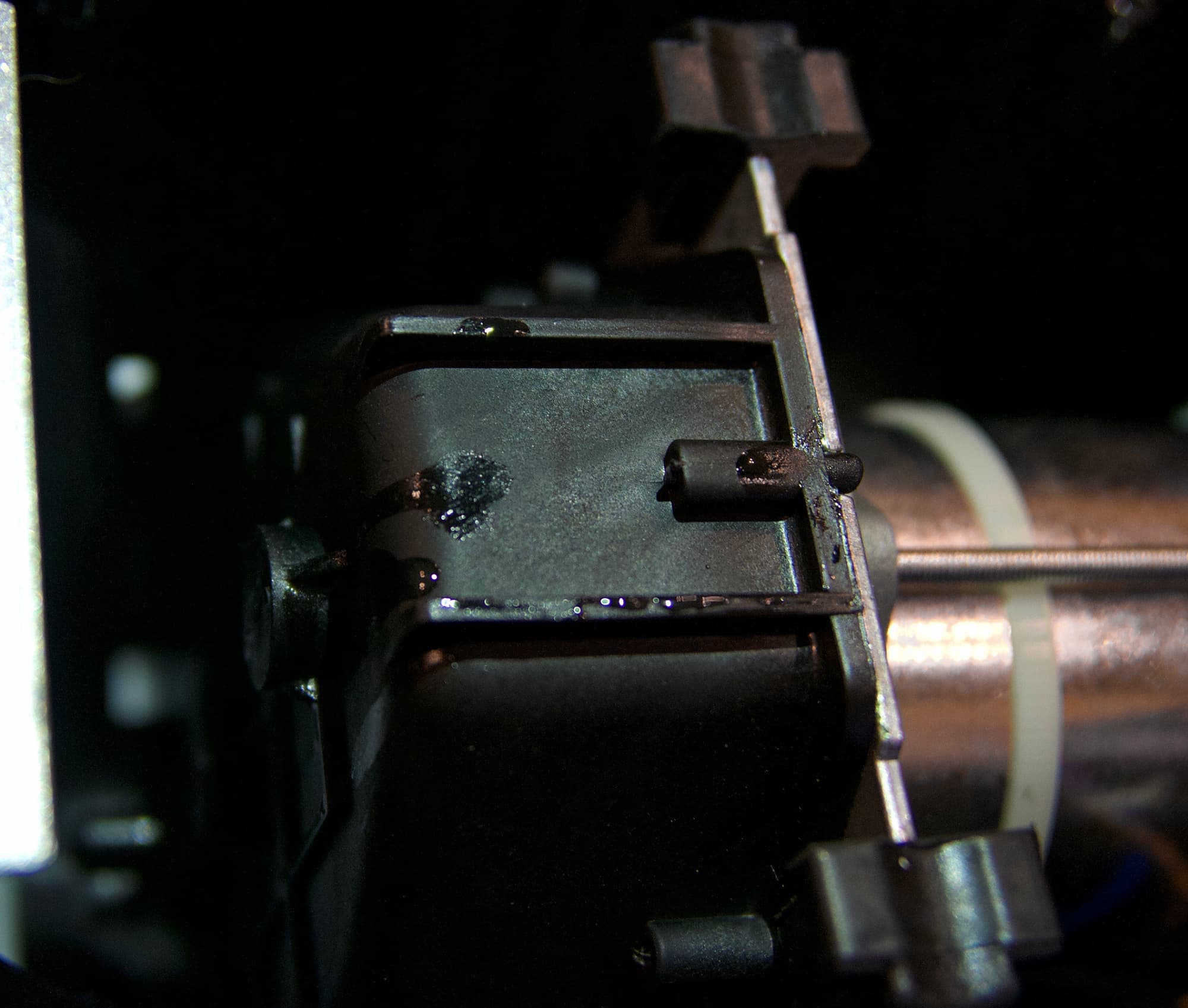 Прикинув, что самый простой фрукт в отжиме — это виноград, мы купили 4 кг и решили дать соковыжималке еще один шанс. Как и следовало ожидать, сочный виноград легко разделялся на сок, стекающий в емкость из отверстия для выхода сока, и достаточно сухой жмых, выбрасываемый вперед из блока в другую емкость. Но через какое-то время наслаждения этой идиллией мы заметили, что из-под моторного блока стремительно течет черная жидкость. После внимательного осмотра оказалось, что сок под давлением не только стекает в емкость, но и выталкивается в сторону крепления шнека к мотору. А поскольку конструкция всего отсека не герметична, сок попадает в место крепления и стекает по винту в моторный блок, откуда вместе с технической смазкой капает на стол вниз.