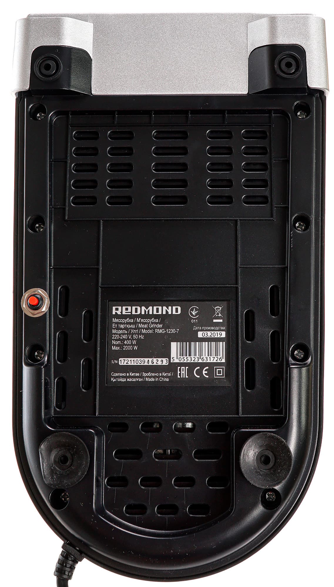 Под днищем мясорубки есть кнопка сброса защиты от перегрузки, которая нужна для пуска двигателя после устранения проблемы, вызвавшей перегрузку (попавшая кость и прочее). Больше никаких органов управления прибор не имеет.