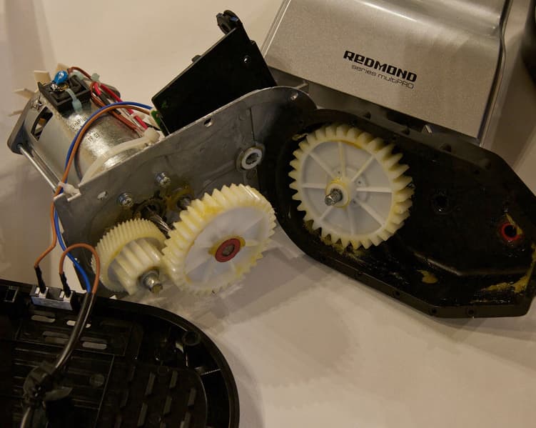 После того, как мы рассмотрели внешний вид и все доступные комплектующие Redmond RMG-1230-7, мы решили забраться внутрь моторного блока и изучить эту модель изнутри. Разборка корпуса представляла определенные сложности, так как было необходимо снять серую пластиковую лицевую панель с ручкой, а она крепилась на пластиковых защелках. Предположительно, в специализированном сервисе должны быть съемники для подобных защелок, потому что снять их стандартными инструментами, не повредив и не отломав, довольно тяжело. В остальном все крепилось на обычных крестовых винтах.