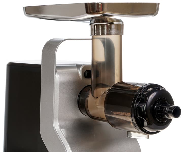 Загрузочный лоток — металлический и оснащен ограничителями, которые препятствуют его вращению на горловине. Он довольно большого размера, нам удалось положить на него около двух килограммов мяса.