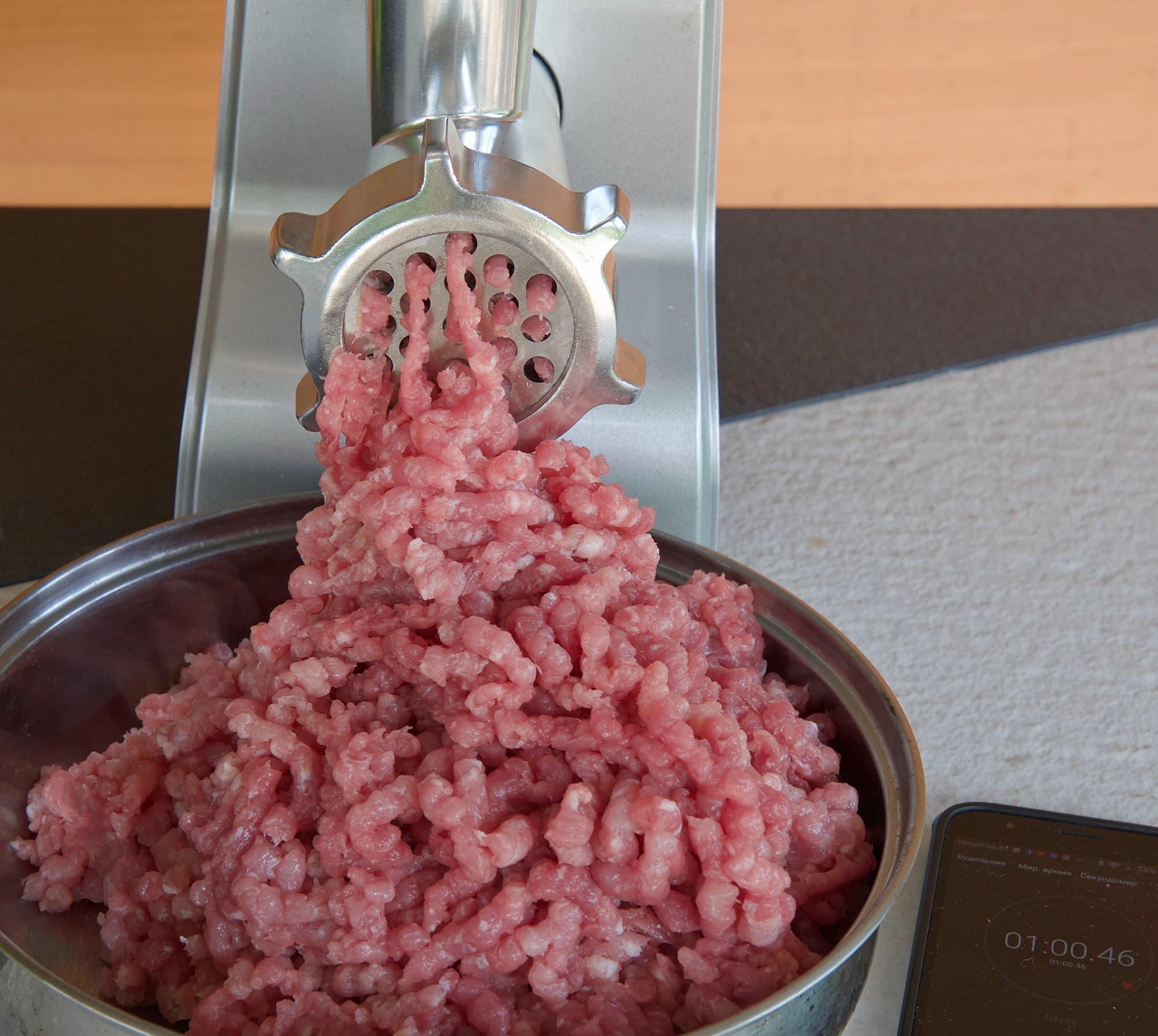 Фарш получился хорошего качества, рубленый, а не давленый. 1,9 кг фарша удалось нарубить чуть менее чем за минуту. Поэтому коэффициент производительности у данной модели мы определяем как 2 кг/мин.